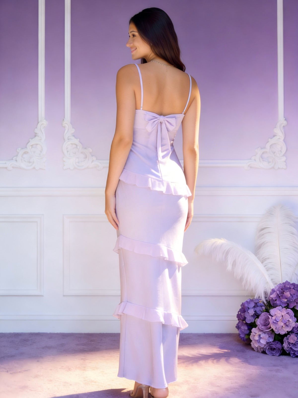 Satin V Neck Bow Ruffles Spaghetti Straps Bridesmaid Dresses